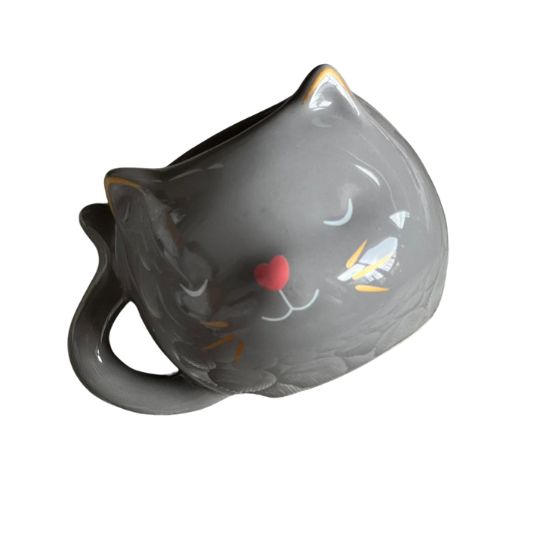 Caneca 3d em porcelana com gatinho de olhinhos fechados desenhados a mão.